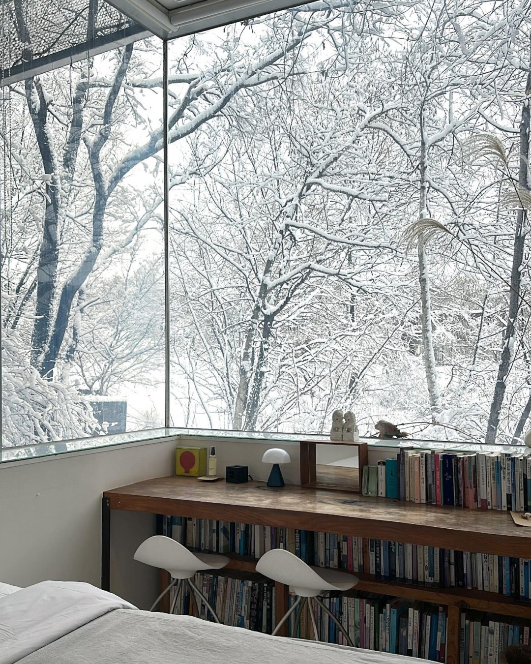 The beautiful ambiance of @motif.1, enhanced by the peaceful atmosphere of books and plants, shines through. Watching Sherlock_HJ's YouTube channel, I‘ve heard that keep-changing perspectives are crucial in space design. So living in a space with a view of the forest seems like a precious experience, offering a constant and unique sight throughout the seasons. 🍀