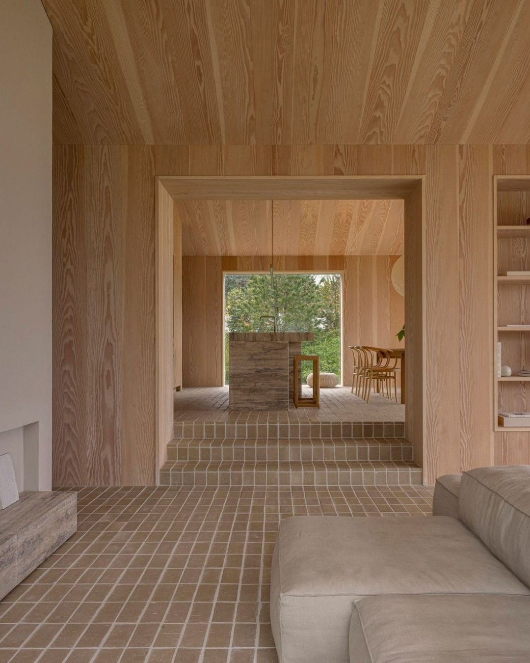 A beautiful space by @normarchitects, where moments of relaxation are sure to come to mind 😌 Layering various materials such as wood, tiles, and stone in beige tones creates a stable and natural ambiance. The landscape design, incorporating diverse trees that can be encountered from various perspectives, adds to the pleasure of viewing.